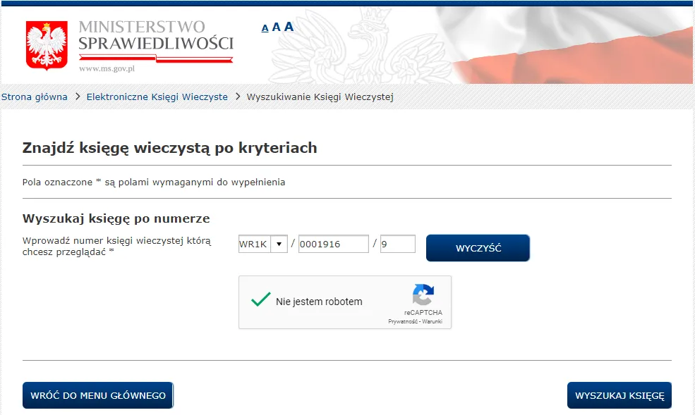 4. Jak uzupełnisz cały numer księgi, zaznacz okienko, że „nie jesteś robotem”.