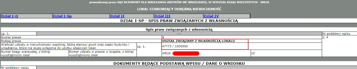 W dziale pierwszym części drugiej znajdują się informacje o udziałach związanych z własnością lokalu: